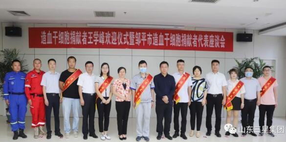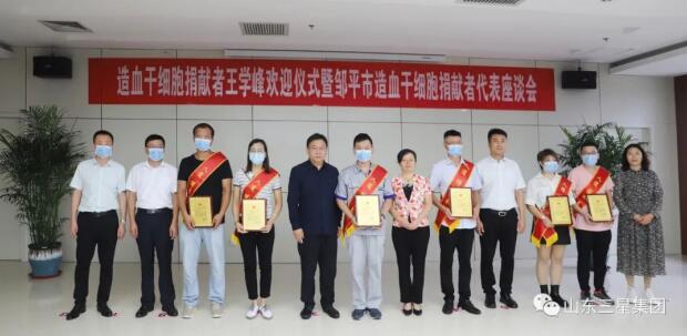 9月16日,造血干細(xì)胞捐獻(xiàn)者王學(xué)峰歡迎儀式暨鄒平市造血干細(xì)胞捐獻(xiàn)者代表座談會在山東三星集團(tuán)舉行。濱州市紅十字會黨組書記、常務(wù)副會長田洪健,鄒平市副市長韓穎、市委宣傳部常務(wù)副部長李偉,韓店鎮(zhèn)副鎮(zhèn)長馬金萍,鄒平市紅十字會常務(wù)副會長張維敏,山東三星集團(tuán)常務(wù)副總經(jīng)理王明亮、副總經(jīng)理孫喜、綜合管理部經(jīng)理韓延庭,本次造血干細(xì)胞捐獻(xiàn)者王學(xué)峰及鄒平市前5位造血干細(xì)胞捐獻(xiàn)者出席座談會。