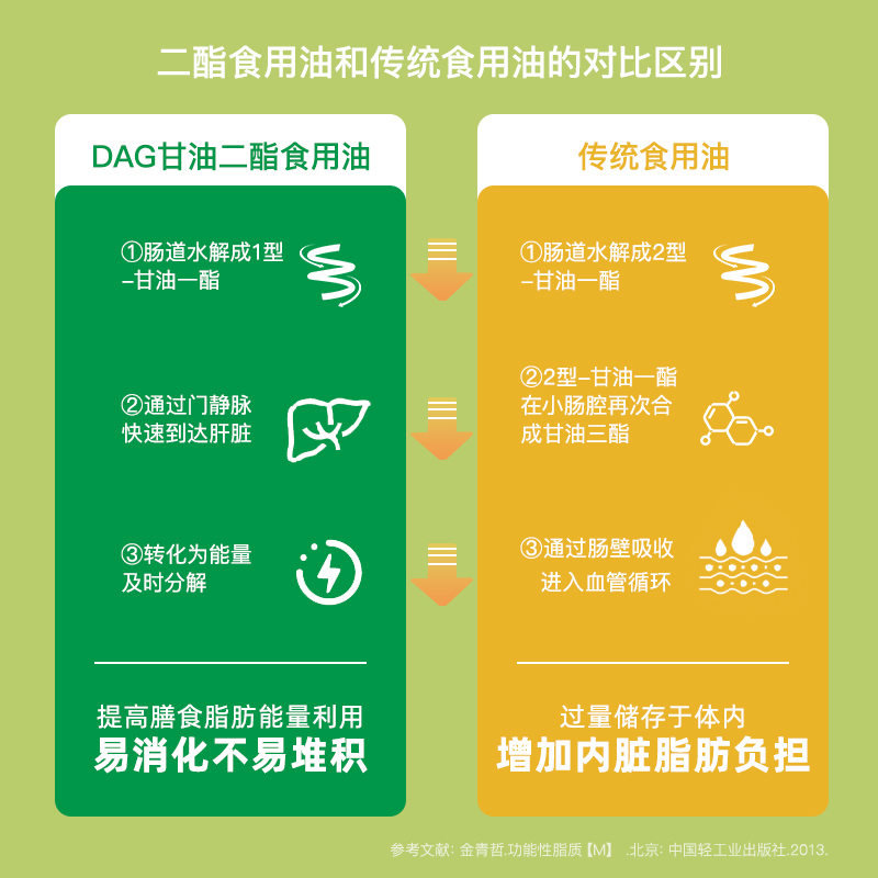 甘油二酯不同于甘油三酯。由于在結(jié)構(gòu)上缺少一個(gè)脂肪酸,甘油二酯在經(jīng)小腸粘膜細(xì)胞消化吸收后,無(wú)法合成甘油三酯結(jié)構(gòu)進(jìn)入血液,而是由號(hào)稱細(xì)胞發(fā)電站的線粒體代謝供能,不易在體內(nèi)造成脂肪累積。因此廣受關(guān)注。