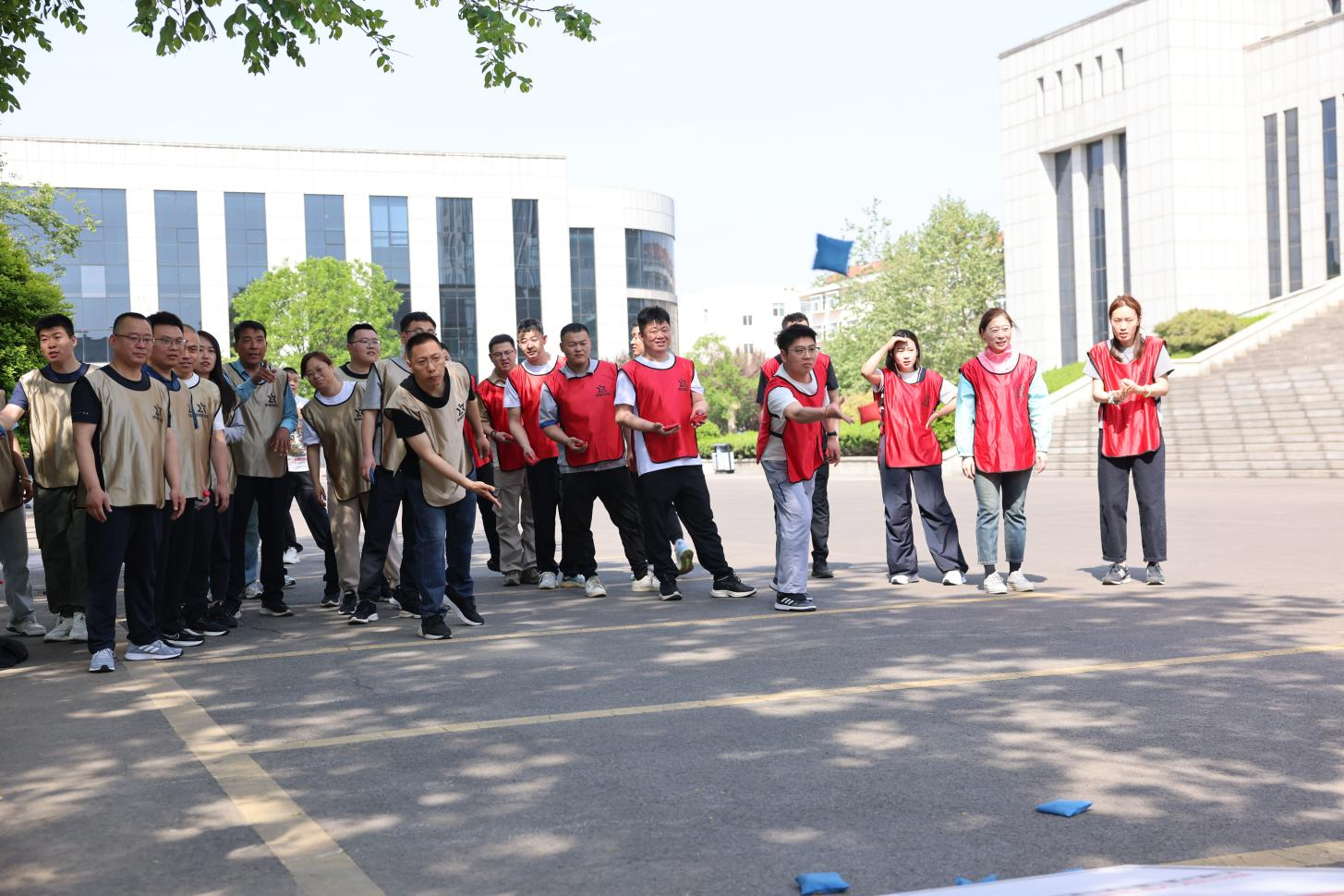 只要將沙包扔進(jìn)洞或木板上即可得分,項目規(guī)則簡單卻充滿挑戰(zhàn)。隊員們紛紛施展技巧,有的穩(wěn)扎穩(wěn)打,精準(zhǔn)瞄準(zhǔn);有的大膽嘗試,力求一擊即中,比分交替上升,難分伯仲。