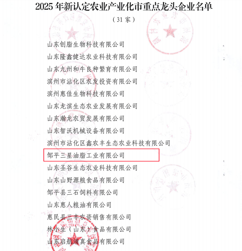 近日,濱州市農(nóng)業(yè)農(nóng)村局等聯(lián)合發(fā)布了2025年新認(rèn)定農(nóng)業(yè)產(chǎn)業(yè)化市重點龍頭企業(yè)名單,鄒平三星油脂工業(yè)有限公司憑借其在糧油加工領(lǐng)域的卓越實力和行業(yè)領(lǐng)先地位,入選該名單。